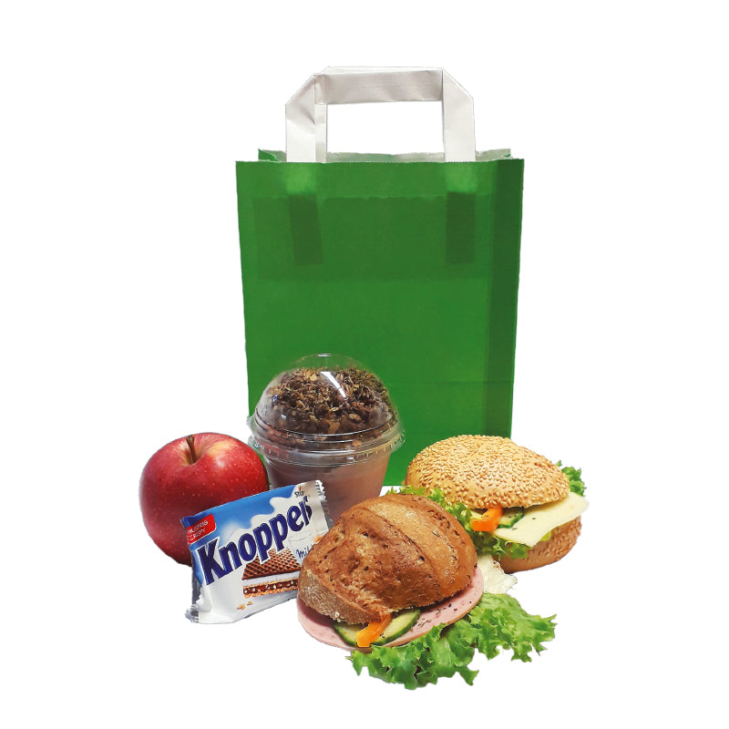 2 körnige Brötchen belegt mit Schinken und Käse dazu ein Apfel, ein Joghurt und ein Knoppers